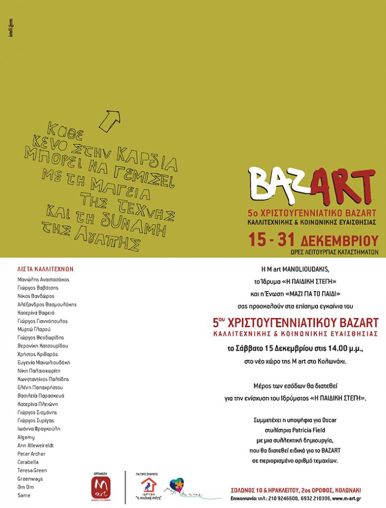 The meeting point of the 5th Bazart, was M art’s new home. M art Space, in the center of Athens, was created as part of our wider effort to promote art. M art Space is located at Solonos 10 & Iraklitou Str. (2nd floor) in Kolonaki. Bazart was hosted in M art Space, and included projects of emerging and well-known artists, from Greece and abroad.