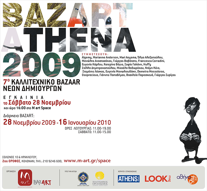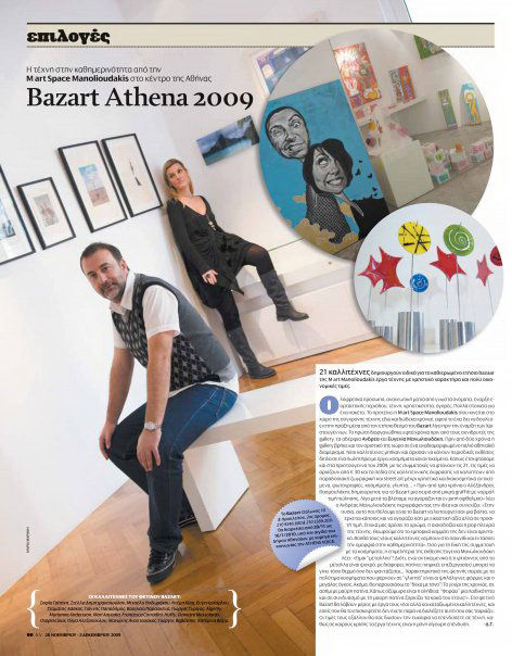 Twenty artists exhibited their work at the 7th Bazart Athena, some for the first time. Among the works for sale were sculptures, paintings, photographs, ceramic objects, modern art jewels with innovative materials combined with precious metals, utilitarian artifacts, books, lifestyle fashion accessories, original Christmas decorations, etc.