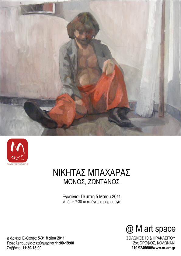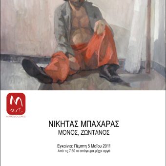 Both poet and artist, Nikitas Baharas, penetrates into human nature and soul through his paintings. His work, full of tension and peace, rivalry and friendship, life and death, opposes the meaningless life, the status quo, the “tale of the dream” that each one of us has, with an authentic, individual – and not massive- revolutionary spirit, which first criticizes itself and then the ideals for which it revolts. This process may also stem from the same conflicting relationship of the artist with himself, this constant criticism and self-criticism that can only bring improvement, healing and “cleansing” or, as Nikitas writes in one of his poems, “to get to the top where the Sun rises”.