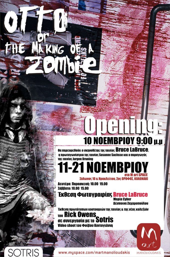 Finally completing the picture of his own artistic family as it was formed in “Otto, or Up With Dead People”, we present the costumes designed for the film by Rick Owens and pieces from his new collection in collaboration with Sotris. While we give carte blanche to the director Fivo Kontogianni and his collaborators Hector Koufopoulos and Nikos Tseberopoulos to create a video that perfectly completes an exhibition that could only be as strange as Bruce La Bruce’s films.