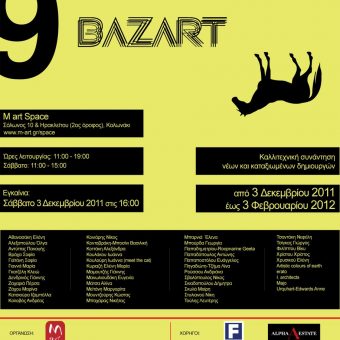 45 καλλιτέχνες, περισσότεροι από κάθε άλλη χρονιά εκθέτουν την δουλειά τους στο 9ο Bazart, μια εκδήλωση που έχει κερδίσει την δική της θέση στην καλλιτεχνική ατζέντα της Αθήνας. Για πρώτη φορά, οι καλλιτέχνες που συμμετείχαν, επιλέχθηκαν μέσα από 150 και πλέον συμμετοχές στην ανοιχτή πρόσκληση ενδιαφέροντος που απηύθυνε το M art space, από τον Σεπτέμβριο μέχρι τα τέλη Οκτωβρίου του 2011.