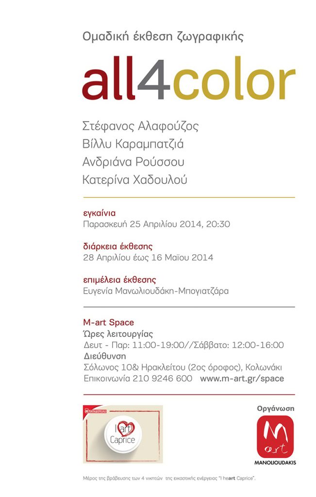 Τα έργα της έκθεσης “all4color” ανοίγονται σε ένα ευρύ φάσμα της δημιουργικής έκφρασης, διαχειρίζονται διαφορετικά τα εκφραστικά τους μέσα, μα συναντιούνται σε έναν κοινό τόπο, μοιράζονται τον θαρραλέο τρόπο που χρησιμοποιούν το χρώμα: όχι απλά σαν εργαλείο, μα σαν ουσιαστικό μέσο απόδοσης μιας αίσθησης, ενός συναισθήματος φευγαλέου μα και μαζί βαθιά αναγνωρίσιμου. Μία κοινή γλώσσα ενώνει τα έργα και τα φέρνει σε απευθείας διάλογο με τον θεατή, αρχικά μέσα από μια στιγμιαία εντύπωση και στη συνέχεια μέσα από ενδιαφέρουσα, γοητευτική «συνενοχή».